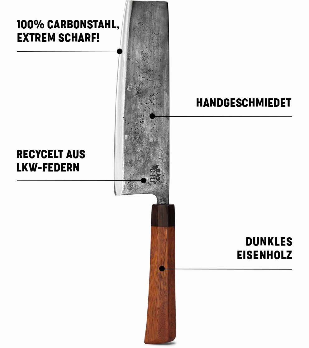 Hier seht ihr, was die Black Chili Messerentwicklung in den letzten Jahren erreicht hat. Links ein Messer der Stunde 0, als wir 2015 zum ersten Mal nach Vietnam kamen. Rechts ein Black Chili Messer der 5. Generation, welches ihr aktuell in den Händen haltet. Hier geht's zu allen Black Chili Generationen >