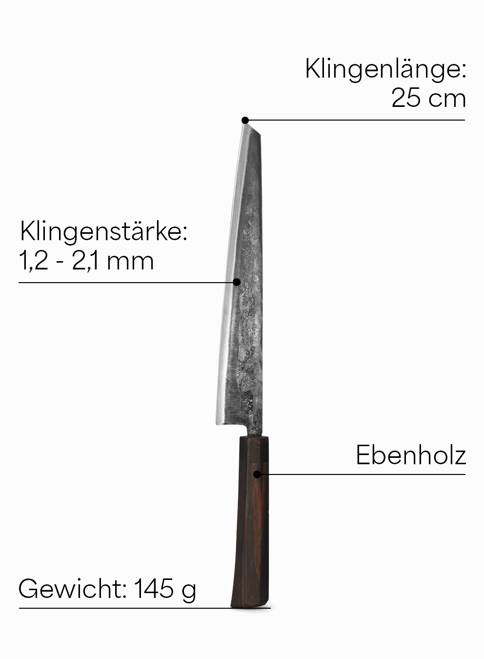 Der Black Chili Spezialist für lange, präzise Schnitte. Brot, Sushi, Schinken oder andere Premiumstücke zerschneidet das NAGA-VIPER-25 mit seiner besonders langen, dünnen und flexiblen Klinge wie im Traum.