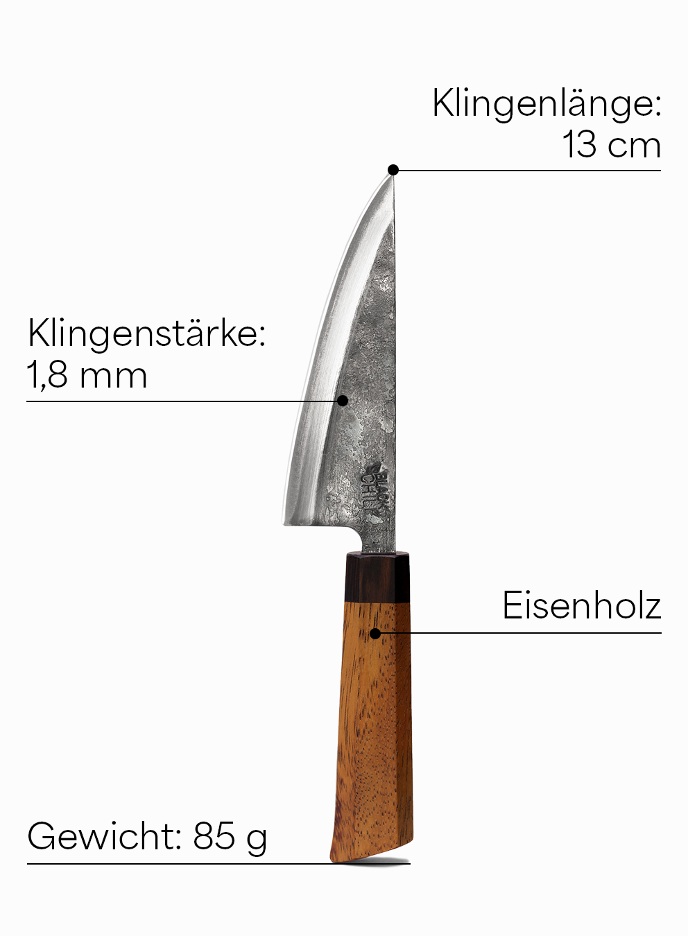 Mittlerer Länge und dennoch hauchdünnes Fliegengewicht! Die Klingengeometrie mit leichtem Schwung und die Mittlere Klingenlänge machen es zum Allroundtalent. Kurze Sägeschnitte und Druckschnitte für Gemüse, Brot und auch mal Fleisch.